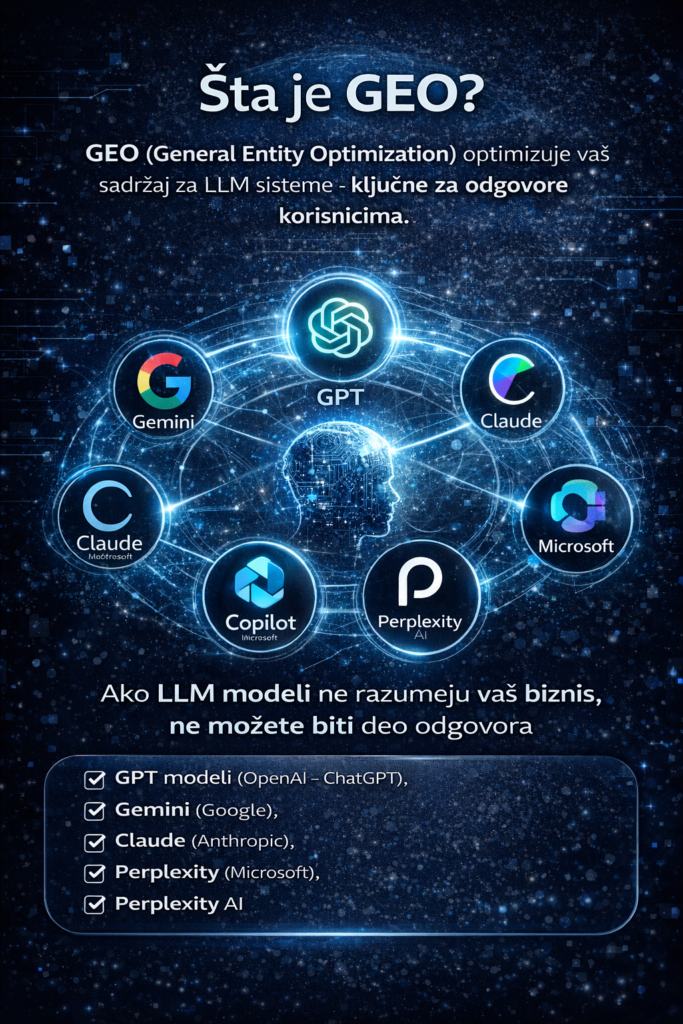 GEO je proces strateške optimizacije vašeg brenda, sadržaja i digitalnog identiteta kako bi veliki jezički modeli (LLM) razumeli ko ste, prepoznali vašu ekspertizu, procenili vas kao pouzdan izvor i koristili vas u generativnim odgovorima.